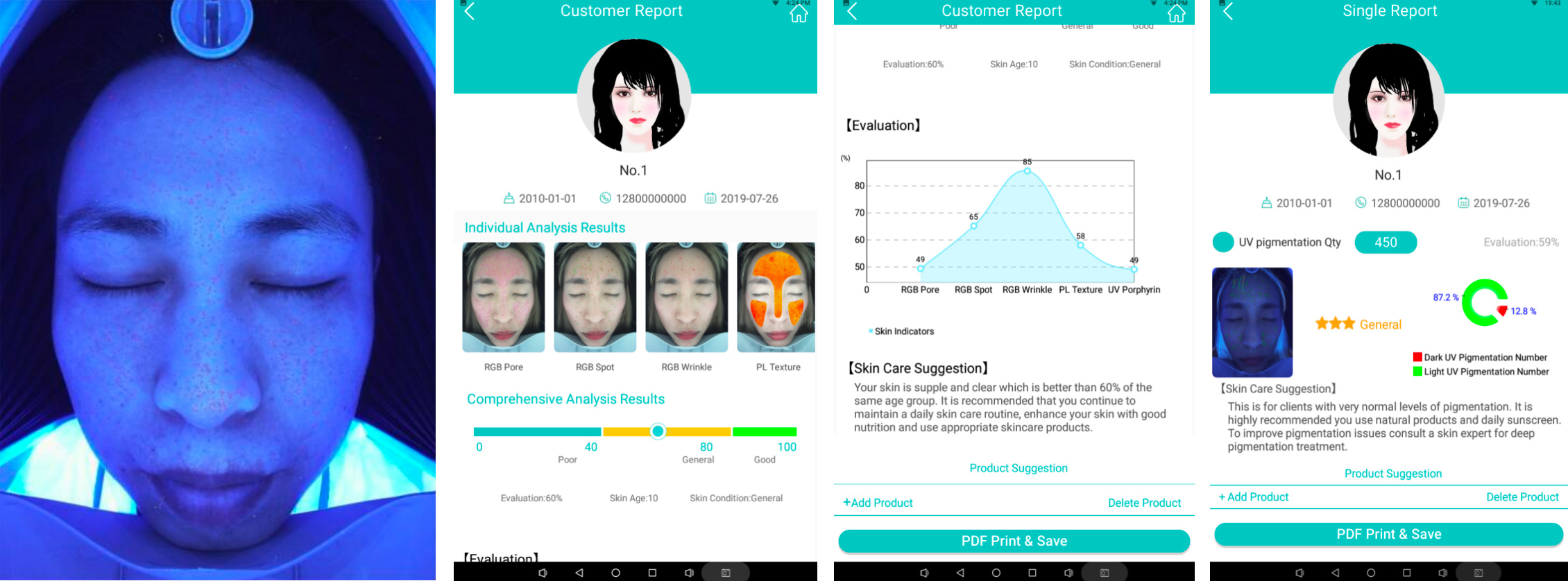 紫外線卟啉:代表當前真皮層油脂分泌和黑頭分布。 可能滯留在毛孔中的細菌排泄物。 紫色斑點代表真皮層油脂分泌,黑頭嚴重,有潛在感染狀態,紅色斑點代表深層卟啉情況比紫色斑點嚴重。 百分比越高,UV 卟啉狀態越好,深層油脂和黑頭越少。